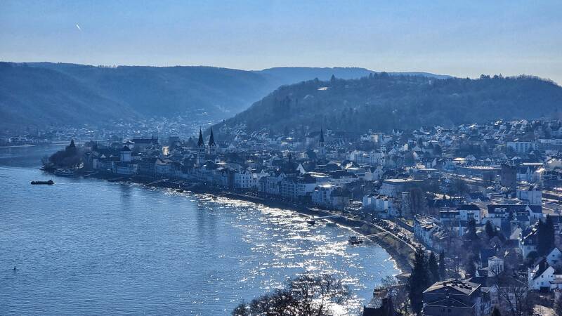 Nach einer geruhsamen Nacht in Boppard begann die achte Etappe mit einem gemütlichen Bummel an der Rheinpromenade entlang. Doch der nächste Berghang nähert sich schon, und der Respekt vor seinem nicht gerade unbeträchtlichen Anstiegswinkel wächst dabei von Minute zu Minute.
