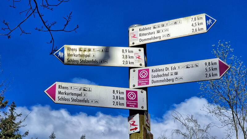 Hier lugt Schloss Stolzenfels noch einmal durch die Hügel, während die Lahnmündung auf der anderen Rheinseite Ober- und Niederlahnstein trennt, und vom benachbarten Dommelsberg das schon deutlich näher gerückte Koblenz mit seiner Festung Ehrenbreitstein umso eindrucksvoller erscheint.