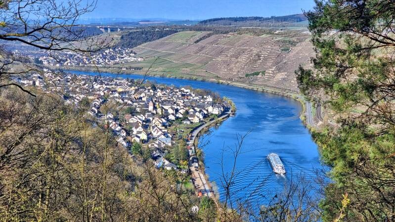 Apropos Mosel: Entdecken lässt sich die "Frau von Vater Rhein", wie sie gerne auch besungen wird, schon früh und aus ziemlich großer Höhe - kaum, dass man den Layer Kopf passiert hat. Man blickt dabei auch auf den Ort Lay und kann auf der anderen Flussseite mit Winningen bereits das Etappenziel erkennen, auch wenn der Weg bis dahin noch einen gehörigen Bogen beschreibt.