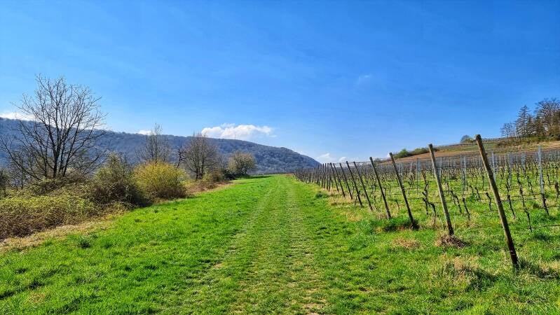 Schließlich zweigt der Moselsteig wieder ab und wendet sich einem höheren Hangweg zu, während der Rheinburgenweg den Weinbergmauern, die dank des sonnigen Wetters schon eine gehörige Wärme ausstrahlen, auf einer tiefer gelegenen Route folgt. Und doch fragte ich mich, wie der nach wie vor gravierende Höhenunterschied bis in das vor mir liegende Winningen hinunter jetzt noch bewältigt werden soll.