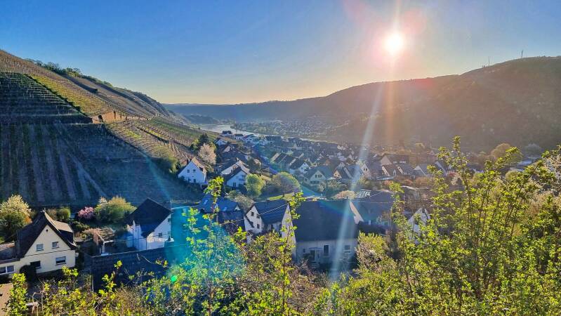 Nun folgt - fast genau in entgegengesetzter Richtung zurück - ein Wiesenweg, bis es an einer leicht zu verpassenden Abzweigung nach links geht und man von Obstwiesen zur Domgartenhütte begleitet wird. Eine schöne Stelle, um einen letzten Blick auf Winningen zu werfen.
