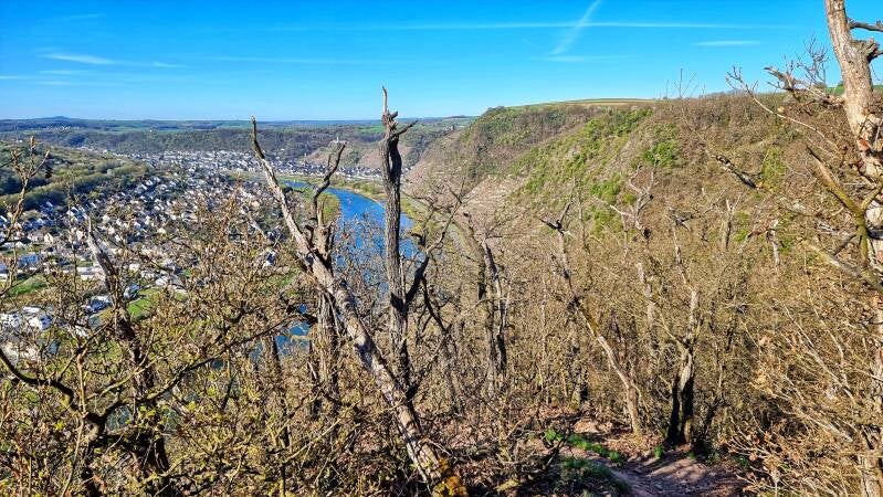 Glücklicherweise ist dieser Abschnitt schnell überstanden, und wie zur Belohnung wartet nur wenige Schritte weiter die atemberaubende Weitsicht der "Blums Lay". Aber das Waldgebiet überrascht noch mit weiteren, vergleichbar schönen Aussichten auf das Moseltal und bis Dieblich. Blicke, die aber durch das austreibende Laub der Bäume schon bald nicht mehr möglich sein dürften.