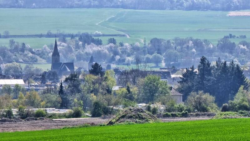 Miesenheim selbst ist schon von weitem zu sehen und liegt im Tal der Nette. Ein Bach, den man beim Eintritt in den Ort überquert und hinter dem dann ein ruhiges Wohngebiet bis zum Bahnhof folgt. Nach der Unterquerung der B 256 beginnt der erste längere Anstieg, von dessen Scheitel man sich ein Bild von der bis heute aktiven Tuffstein-Gewinnung in dieser Region machen kann.