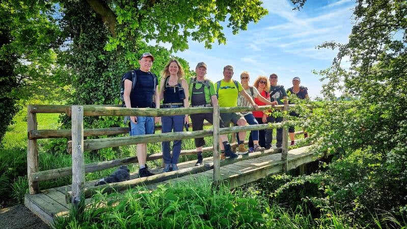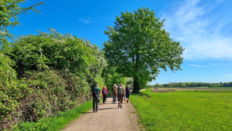 Direkt an der seit 1364 bestehenden Fährverbindung nach Kessel gelegen, zeigte sich der kleine Wanderparkplatz als ein idealer Ausgangspunkt für unsere Acht-plus-Eins-köpfige Gruppe. Denn Mogli, der kesse Vierbeiner, hatte ebenfalls sichtlich Spaß, durch die üppig grüne Landschaft zu tollen.
