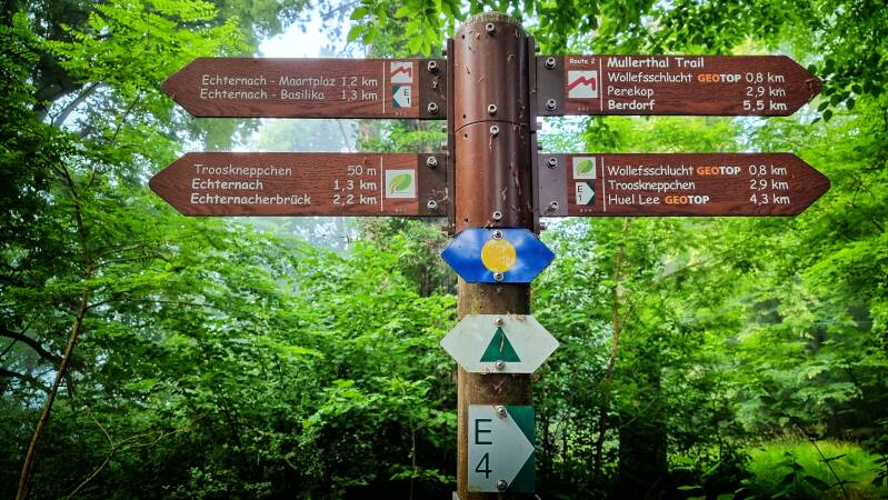 Heute haben wir die Kollektion unserer kleinen Abstecher zu den Highlights des Mullerthals um eine spannende Runde erweitert. Als Ausgangspunkt für die "Wolfsschlucht" - denn um die geht es - nutzten wir einen kleinen Parkplatz, der sich ganz am Ende einer schmalen und bergwärts führenden Wohnstraße in Echternach versteckt.