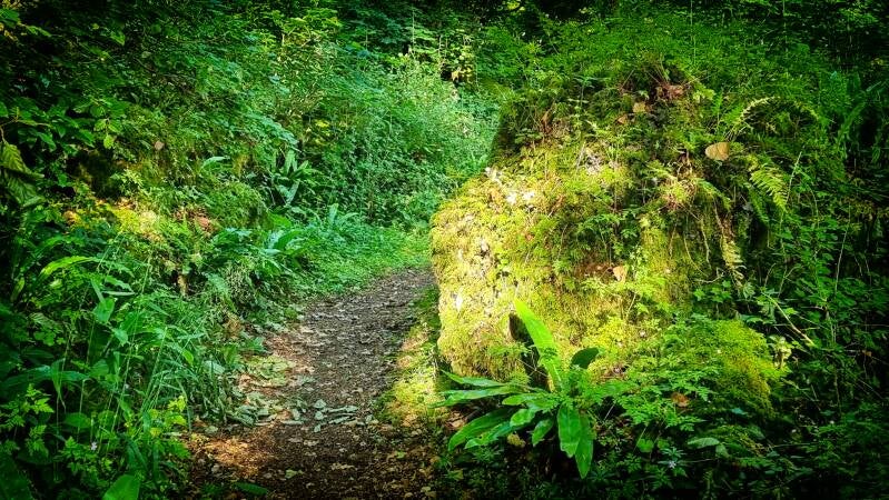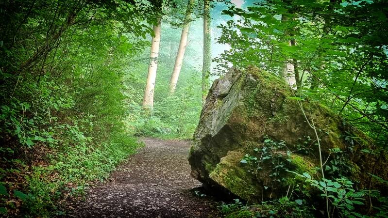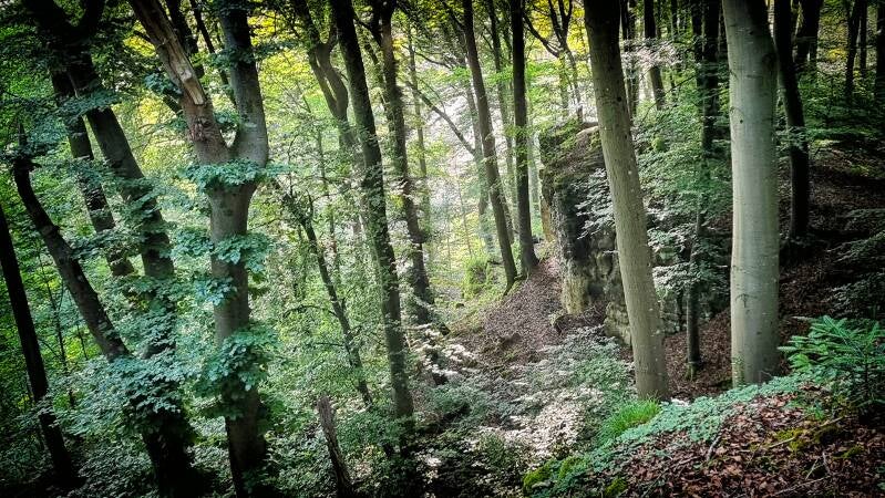 Den zentralen Teil der Wolfsschlucht durchwanderten wir also nun zum zweiten Mal. Um dann, erneut auf den einfachen Waldweg zurückkehrend, diesmal ostwärts wieder Kurs auf den Parkplatz zu nehmen.