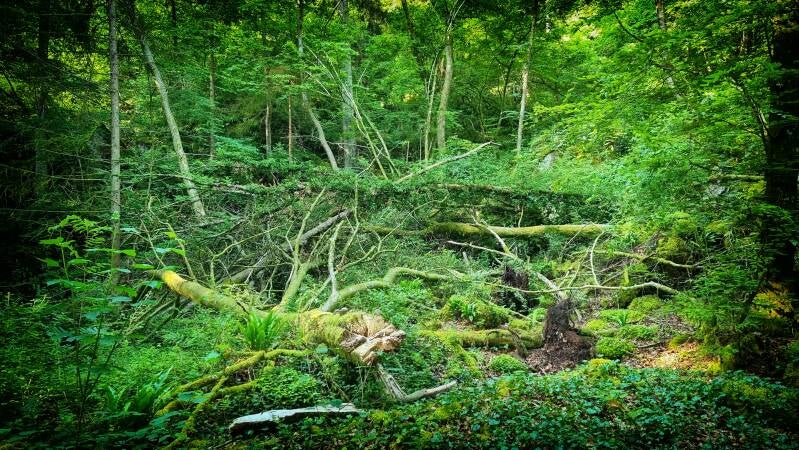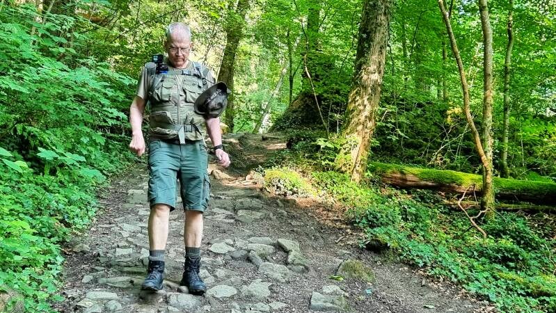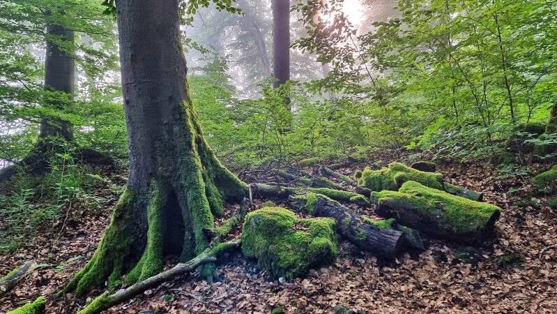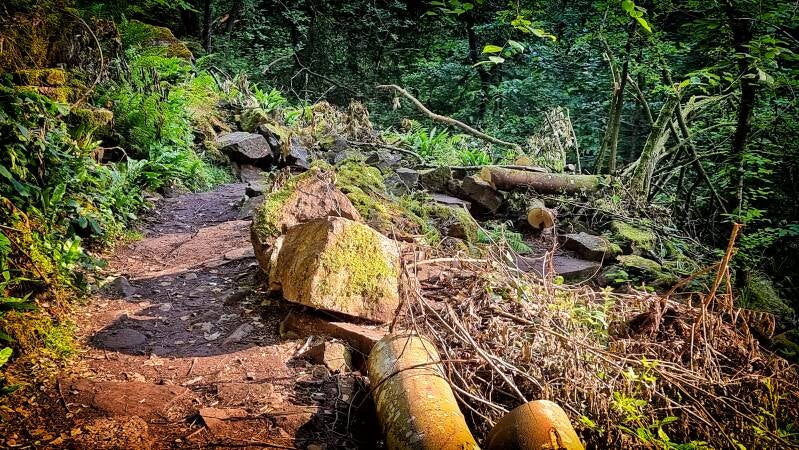 Hier ließe sich das Abenteuer schon beenden, doch wir entschlossen uns für eine ergänzende kleine Runde durch die "Teufelsscharte". Bei dem "Deiwelsschlëff", wie sie auf Lëtzebuergesch heißt und die man - frei übersetzt - auch "Schlaf des Teufels" nennen könnte, handelt es sich aber nicht um eine weitere Schlucht, sondern um unzählige, mit Moos überwachsene Findlinge. Und das in hohem Maß vorhandene Bruchholz verstärkt den unheimlichen Charakter eines verwunschenen Urwaldes noch zusätzlich.