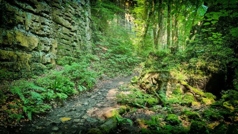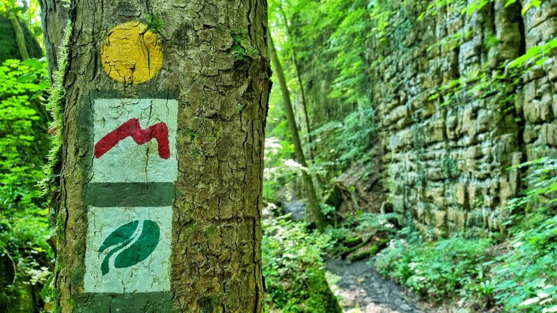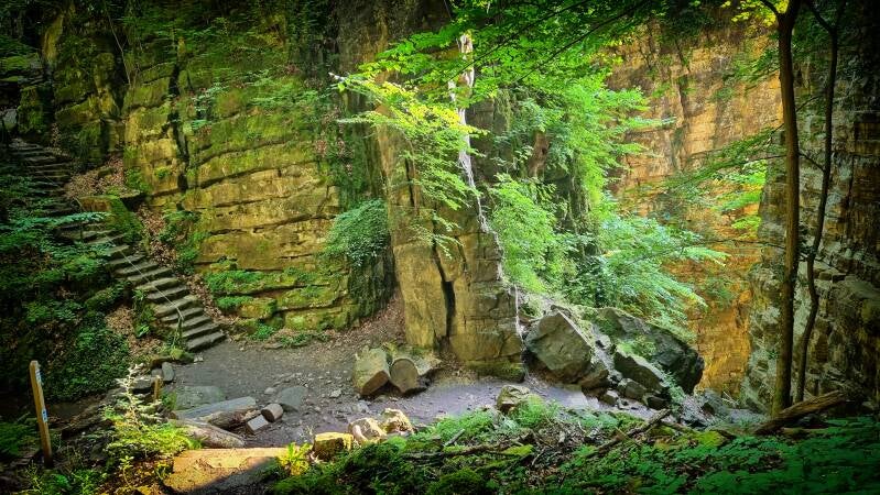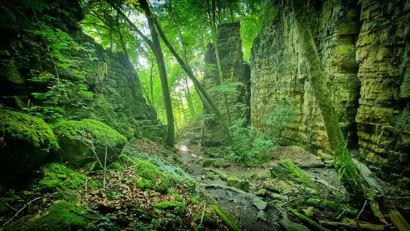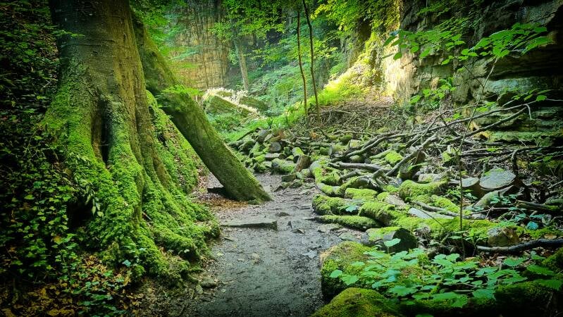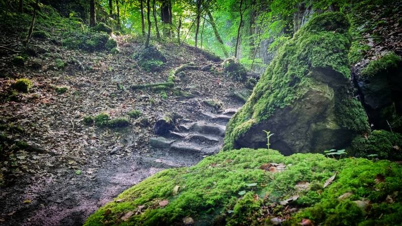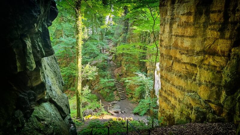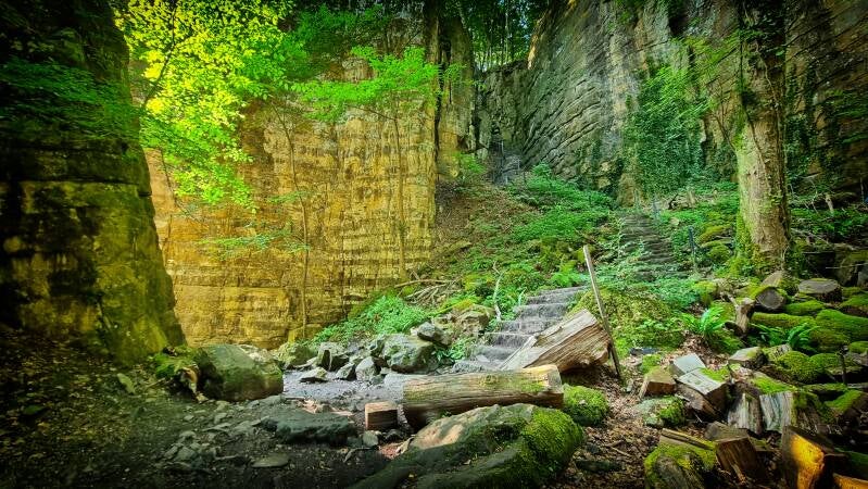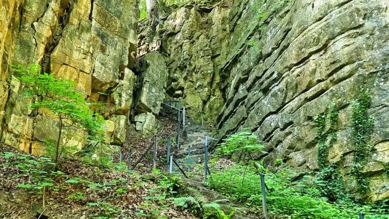 Erneut in das markante Tal abgestiegen, wandten wir uns nun der eigentlichen Wolfsschlucht zu. Wo sich die Felsen fast 50 Meter hoch über die Köpfe der Wanderer erheben und unzählige weitere Stufen die imposanten Felsengebilde zugänglich machen. Schließlich gelangt man zurück auf den normalen Waldweg.