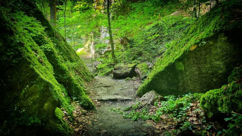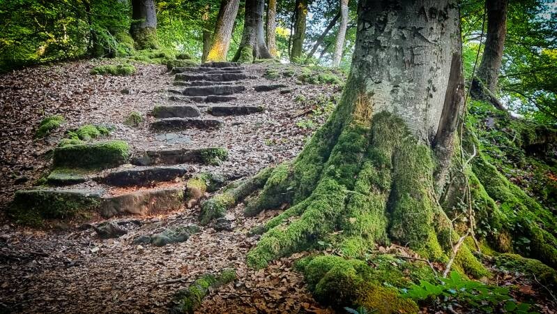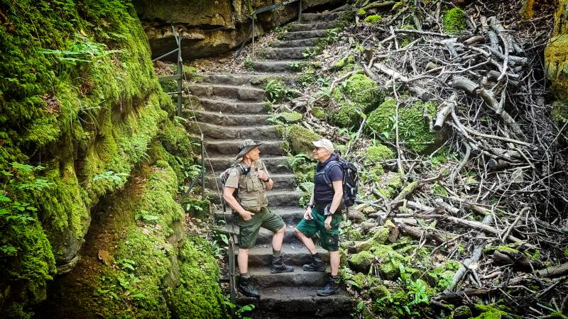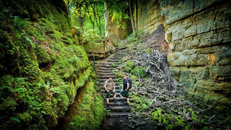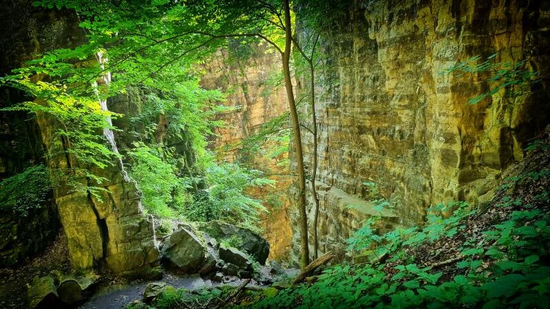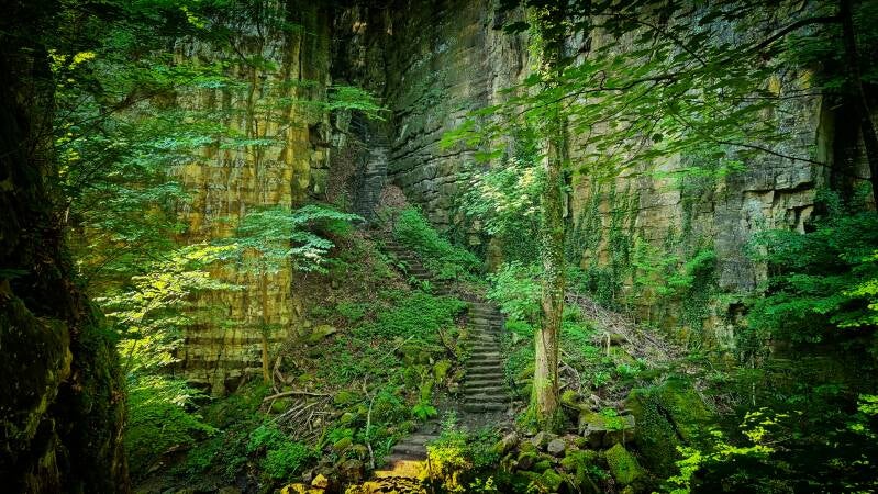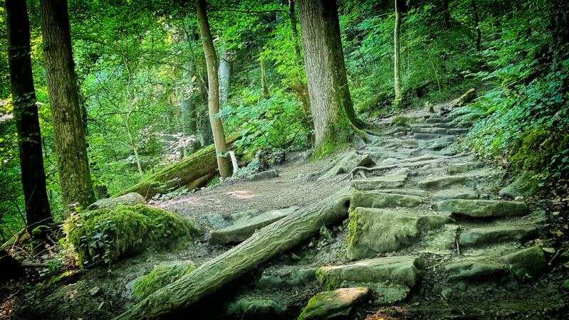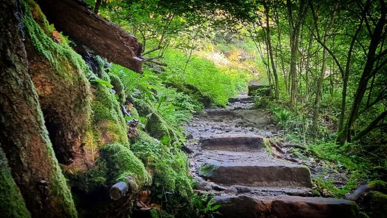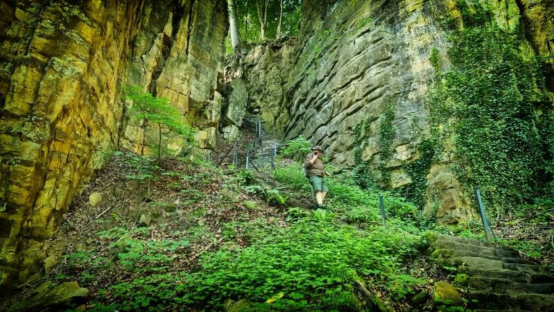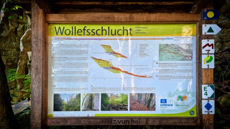 Erneut in das markante Tal abgestiegen, wandten wir uns nun der eigentlichen Wolfsschlucht zu. Wo sich die Felsen fast 50 Meter hoch über die Köpfe der Wanderer erheben und unzählige weitere Stufen die imposanten Felsengebilde zugänglich machen. Schließlich gelangt man zurück auf den normalen Waldweg.