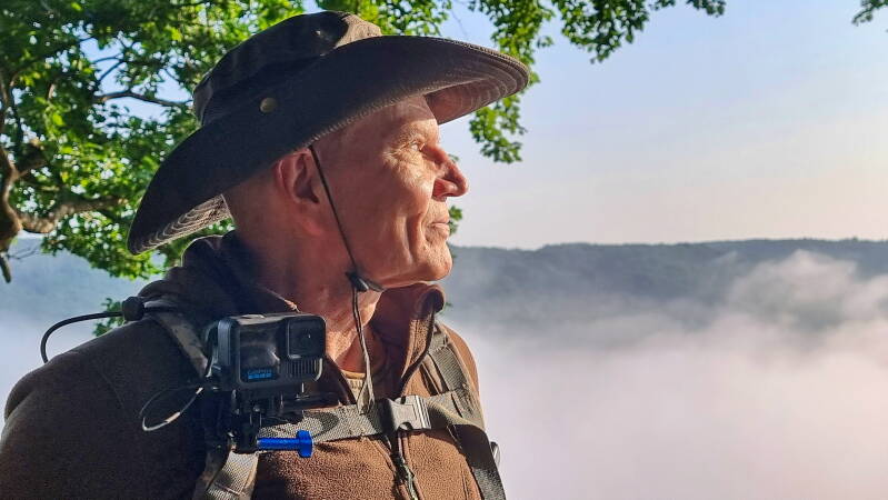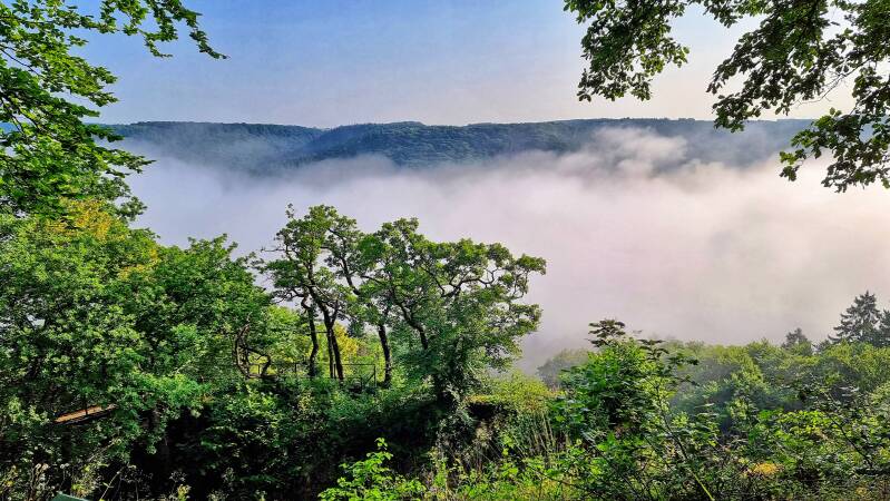 Von hier aus trennten uns nur noch 700 Meter von jenen typischen Felsformationen, für die die "Kleine Luxemburger Schweiz" so berühmt ist. Dort bog unsere Route dann scharf nach links einen Hang hinauf, wo man über zahlreiche Stufen ein Plateau erreicht, das dank seiner Höhe gleich mehrere Aussichtskanzeln aufbietet. Einen besonders spektakulären Anblick lieferten uns die tief liegenden Wolken, die das Tal der Sauer wie unter einer weißen Bettdecke verbargen, während sich über ihnen zugleich der strahlend blaue Himmel ausbreitete.