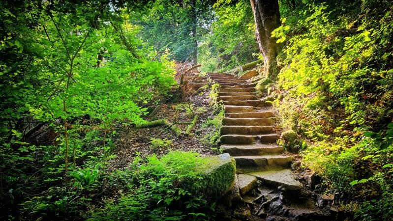 Stufen sind im übrigen eines der Hauptmerkmale dieser Tour, denn sie lassen sich kaum zählen. Es ging schon damit weiter, dass wir von jenem exponierten Punkt, an dem wir uns gerade befanden, erst einmal wieder in das enge und wild zerklüftete Tal hinab steigen mussten.