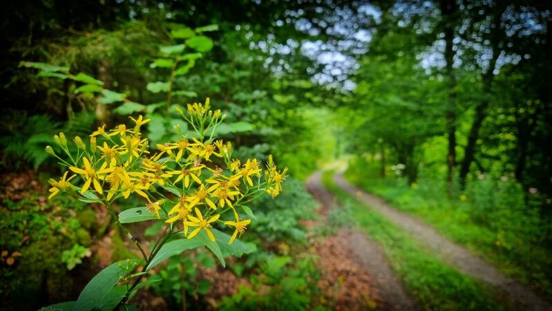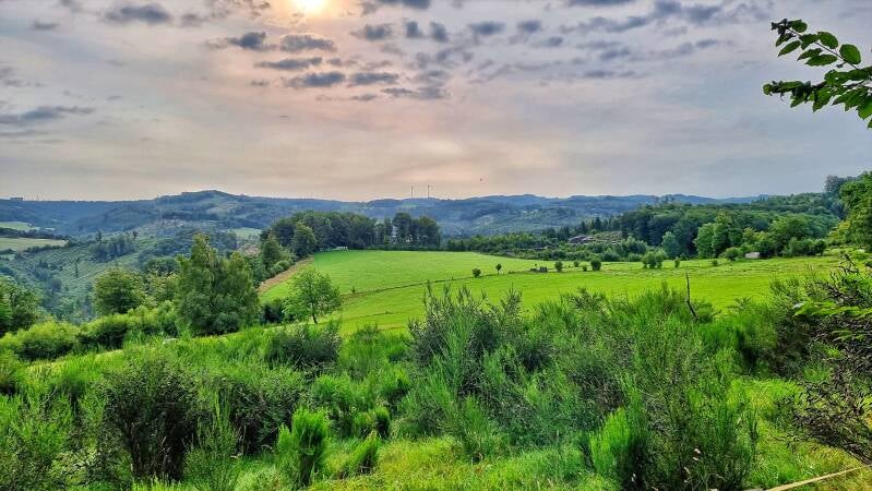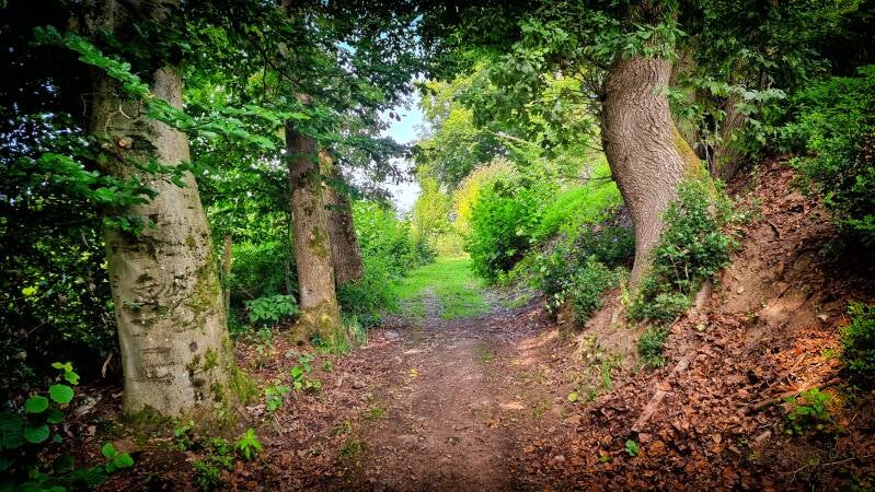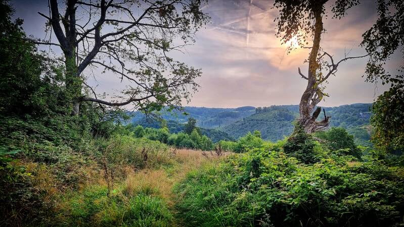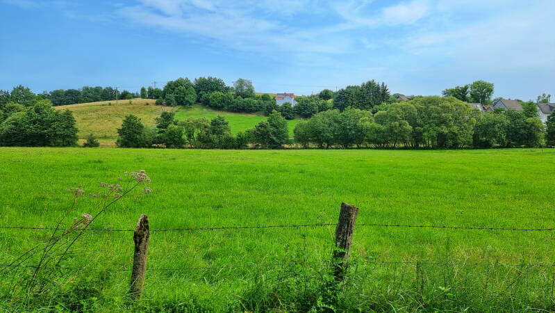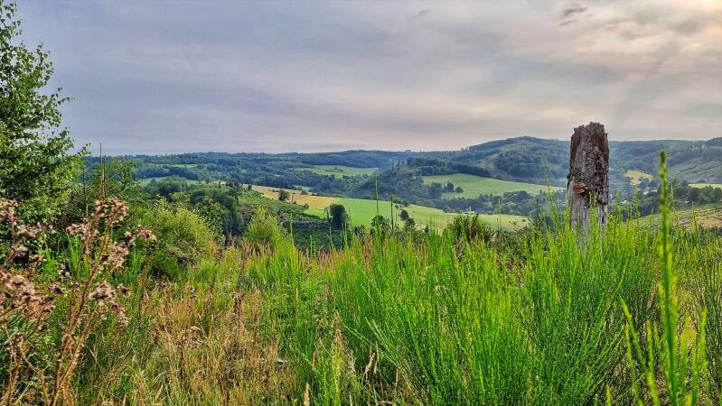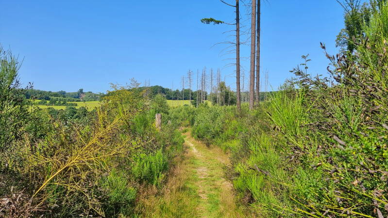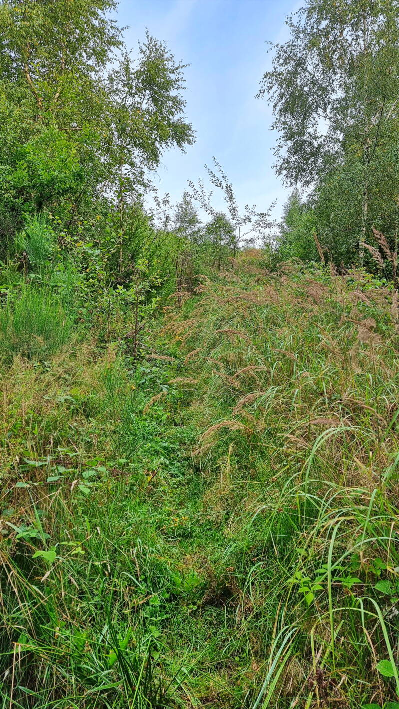 Am Scheitel des Berges führt die Route nach rechts, und prompt wird die Szene naturnäher. Das Gras war hochgewachsen und feucht durch den Morgentau. Ein frisch abgeerntetes Feld machte mir das Vorankommen dann vorübergehend leichter, bis der nächste Kilometer ein Pfaderlebnis der Extraklasse bot. Ich umwanderte den "Aggerhomert", während die einnehmende Flora links und rechts des Weges aber nur widerwillig Platz macht.