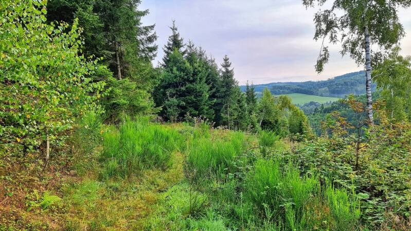 Über eine grasbewachsene Hochebene geht es nun zum Etappenstein von Marienheide. Ich dagegen hatte die Absicht, den vor mir liegenden Bereich des Moosberges noch in die heutige Strecke einzubauen. So handelte ich mir an einem umgestürzten Baum noch eine unerwartet abenteuerliche Kletterpartie ein.
