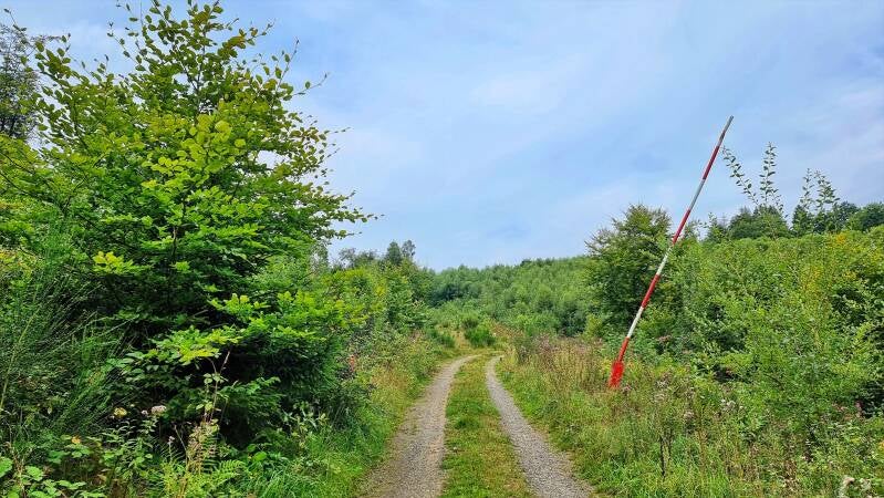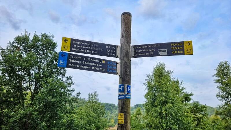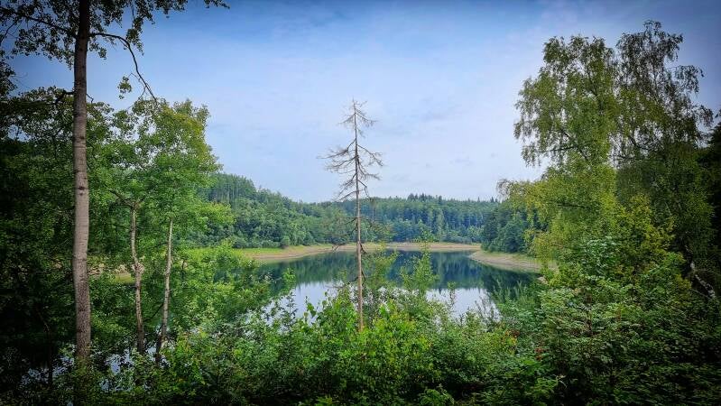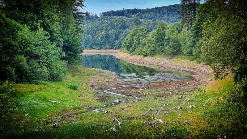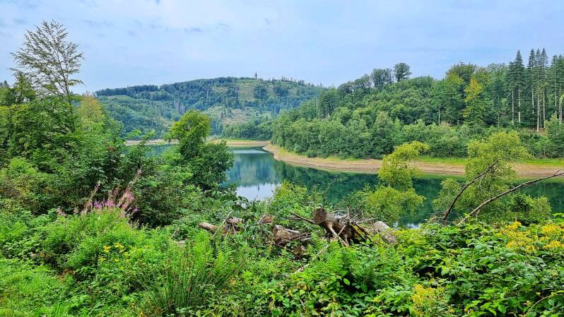 Nach dem Abstieg auf das Niveau der Genkeltalsperre wird ihr der Weg für vier Kilometer nicht mehr von der Seite weichen. Gleich auf der Westseite des Gewässers (und damit auch höchst offiziell wieder im Bergischen Land) macht sich der nächste Anstieg bemerkbar. Mit drei Kilometern hat er eine ausdauernde Länge, doch der Steigungswinkel bleibt moderat.