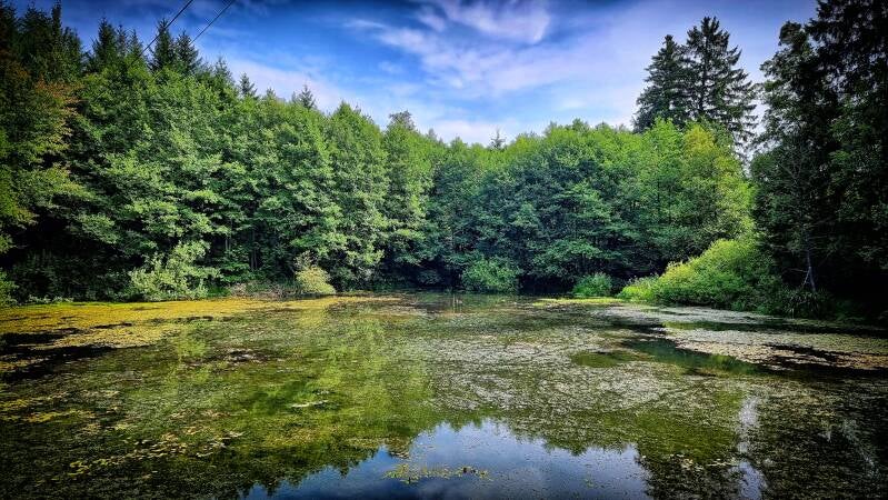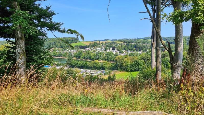 Auf einem schönen Pfad und zuletzt über einen asphaltierten Wirtschaftsweg führten mich die letzten Höhenmeter zum Parkplatz "Lingeser See" hinunter. Dort verließ ich den Bergischen Panoramasteig für heute.