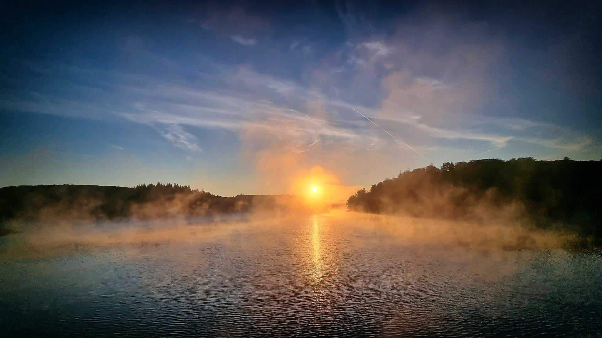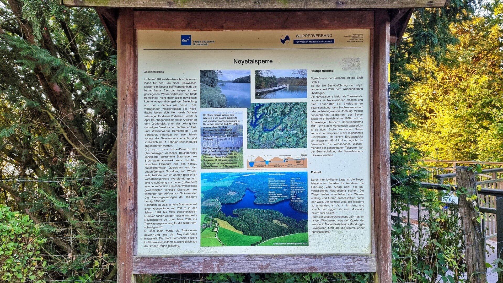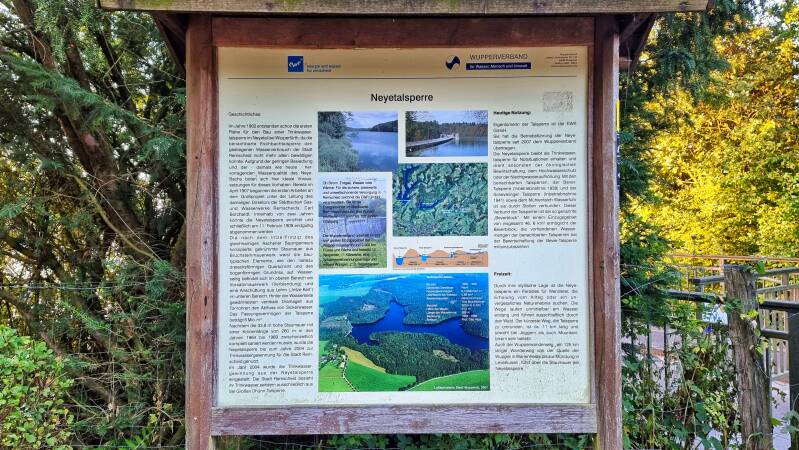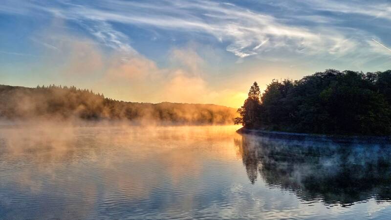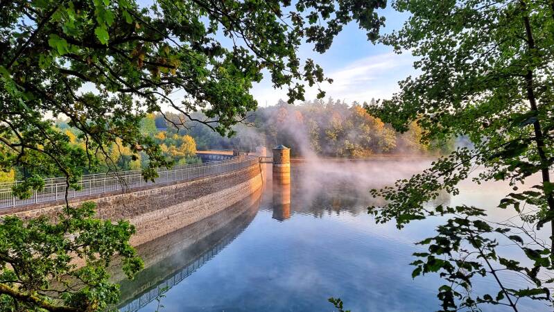 Die Sonne war noch nicht aufgegangen und die Frühtemperaturen ordentlich kühl. Beides änderte sich, nachdem ich an der "Voßkuhle" bei Wipperfürth wieder auf den Trail kam und in Sichtweite des offiziellen Etappensteins zum Aufstieg in Richtung Neyetalsperre ansetzte. Dort trat die Sonne hinter den Hügeln hervor, um die ganze Landschaft in goldenes Licht zu tauchen. Und genau während ich auf der Staumauer stand, brachte sie sich auf der gegenüberliegenden Seeseite in eine perfekt fotogene Stellung. Der Bodennebel begann sich aufzulösen, und ein leichter Wind wehte die Schwaden wie geisterhaft über das Wasser.