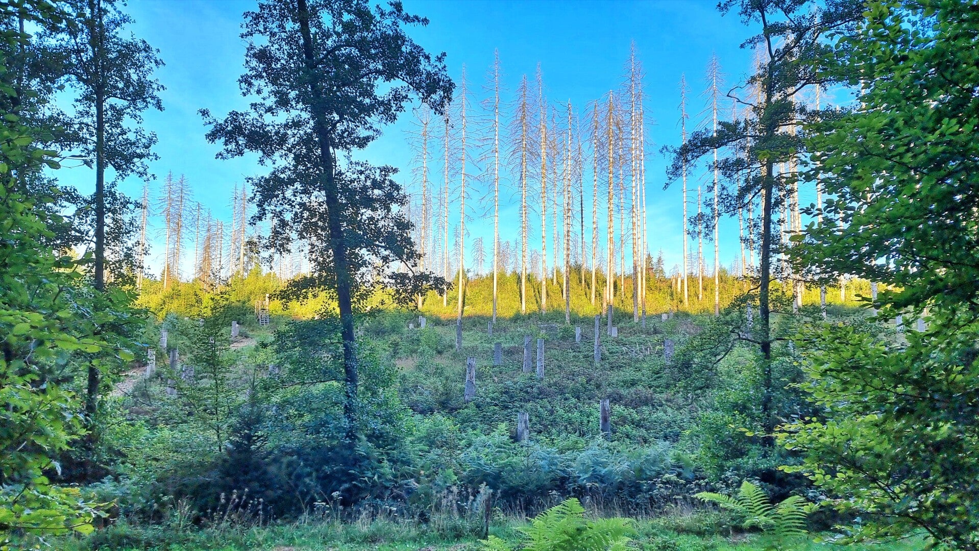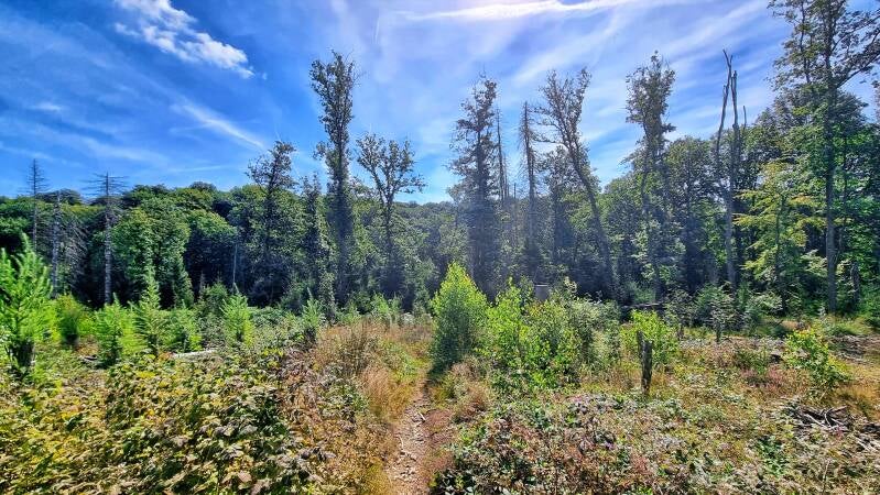 Hinter der K 11 steigt das Gelände wieder an. Und gerade hier, am 381 Meter hohen Röthlingsberg, lassen zahlreiche junge Bäume und leuchtendes Heidekraut erkennen, wie gut es der Natur gelingt, sich ein erst durch den Borkenkäfer, dann durch die Rodungen nochmals drangsaliertes Gebiet erfolgreich zurückzuerobern.
