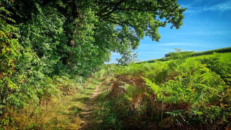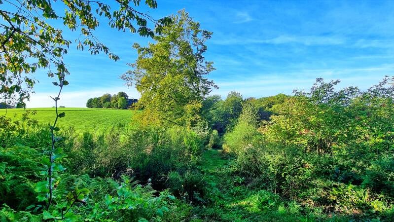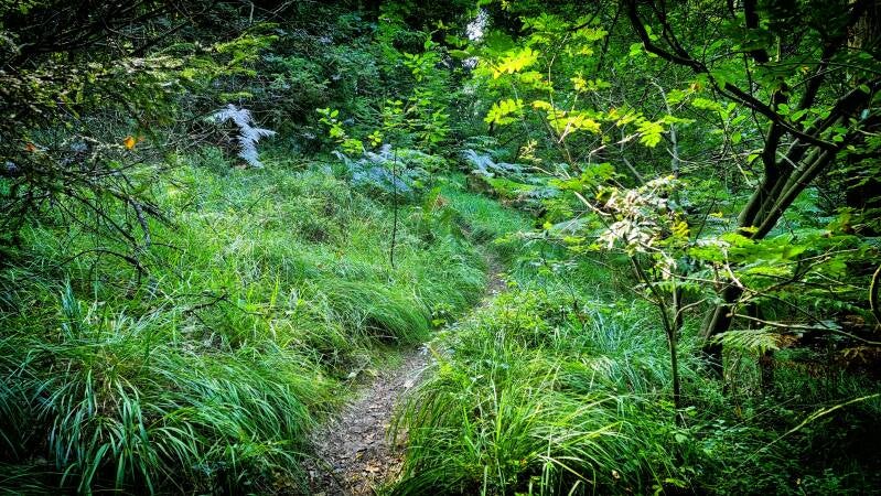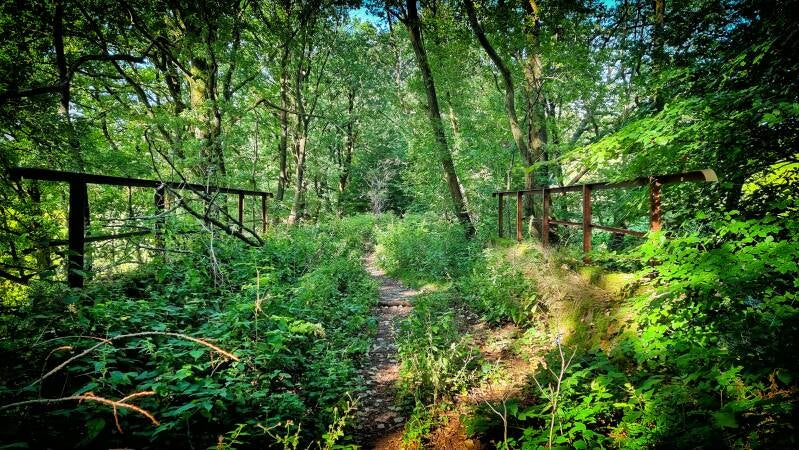 Wäldchen und hügelige Wiesenlandschaften wechseln sich erneut ab, bevor mit dem Schild "Privatweg - Durchgang verboten" unwillkürlich die Spannung zurückkehrt. Denn der Einstieg in das kleine Pfädchen, das den Panoramasteig hier aufnimmt, ist nur schwer zu erkennen und wird von dem wild wuchernden Gestrüpp fast völlig vereinnahmt. Entsprechend spannend gestaltet sich auch die Passage. Sie gipfelt in einem kurzen, aber unsagbar steilen Hang, an dessen Ende sich der Wanderer auf der ehemaligen Trasse der Wuppertalbahn wiederfindet. Doch die früheren Gleise sind längst einem wunderbaren Waldpfad gewichen.