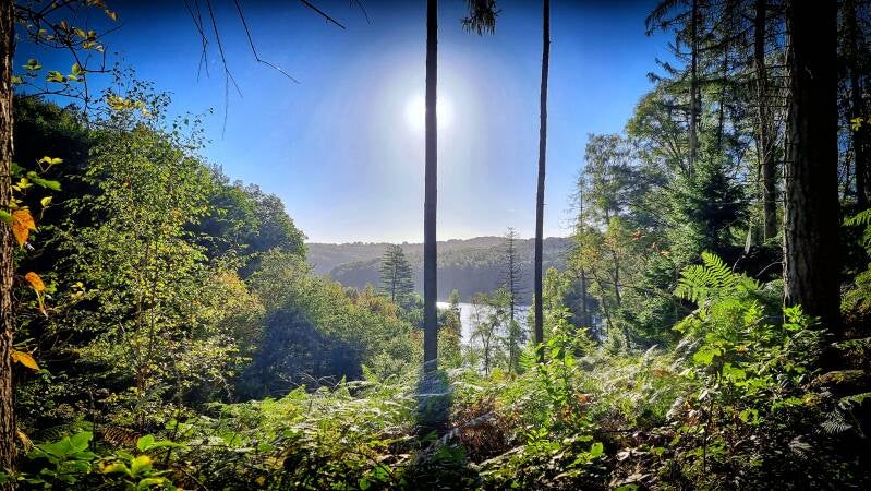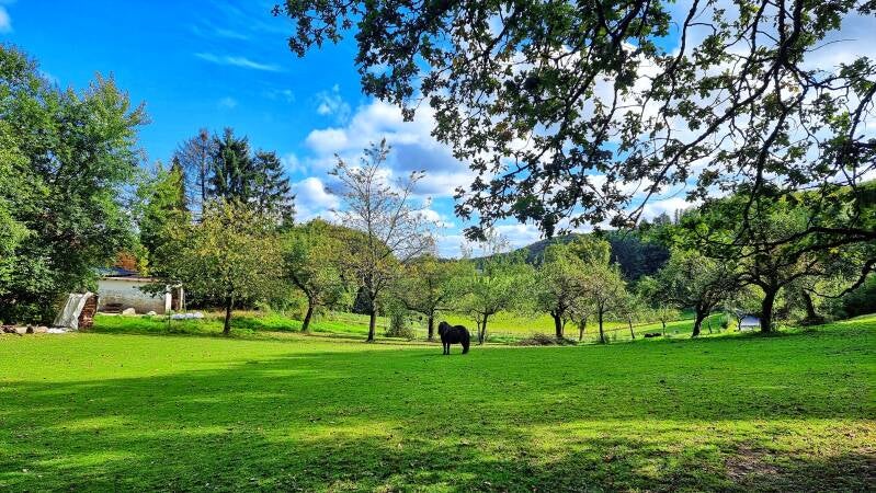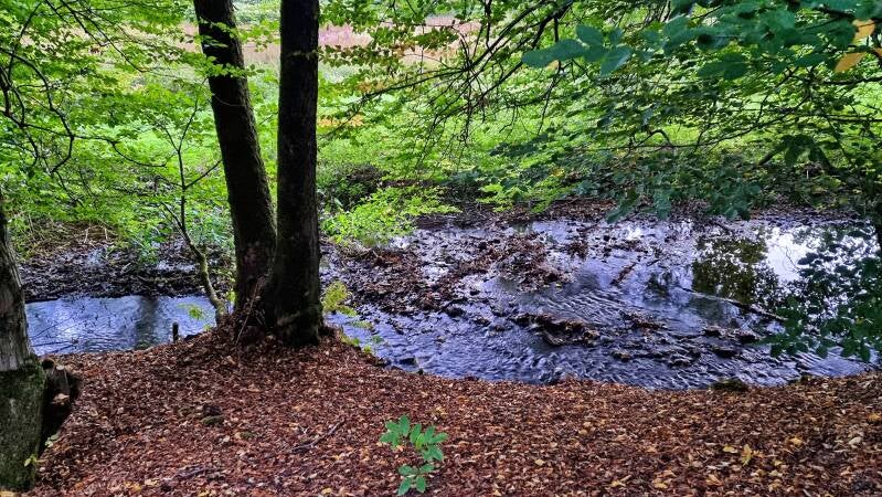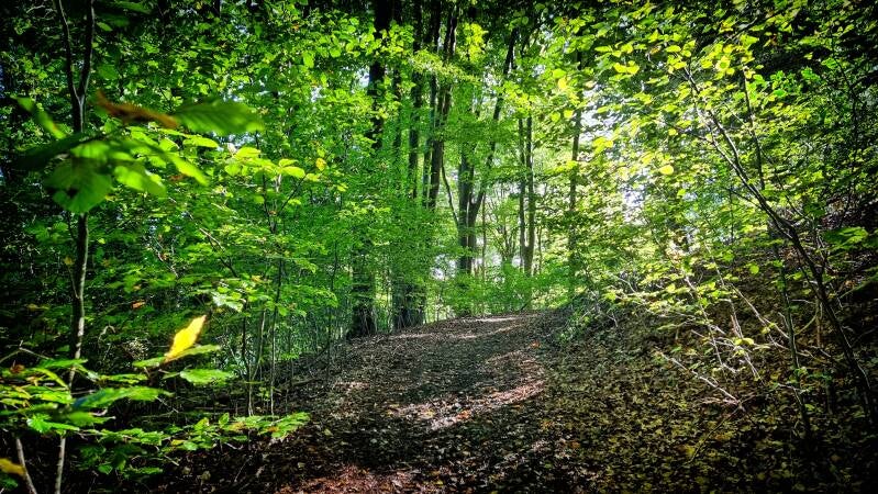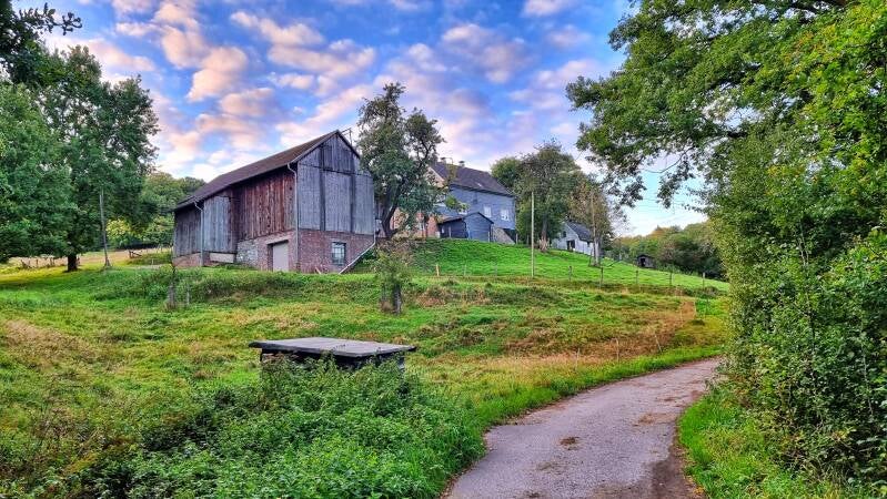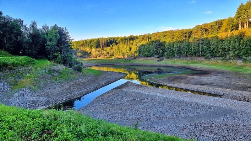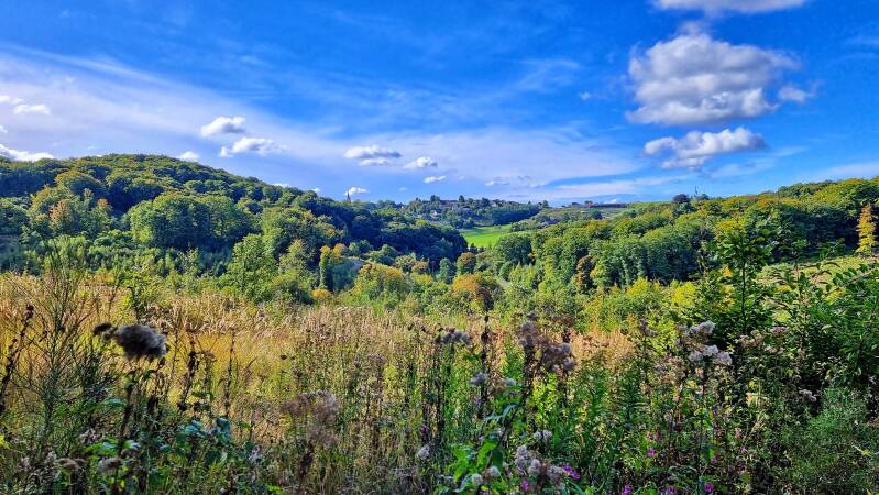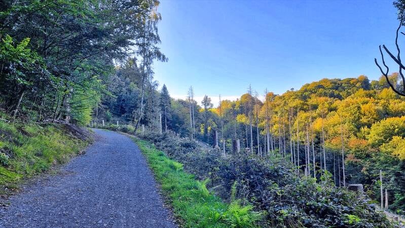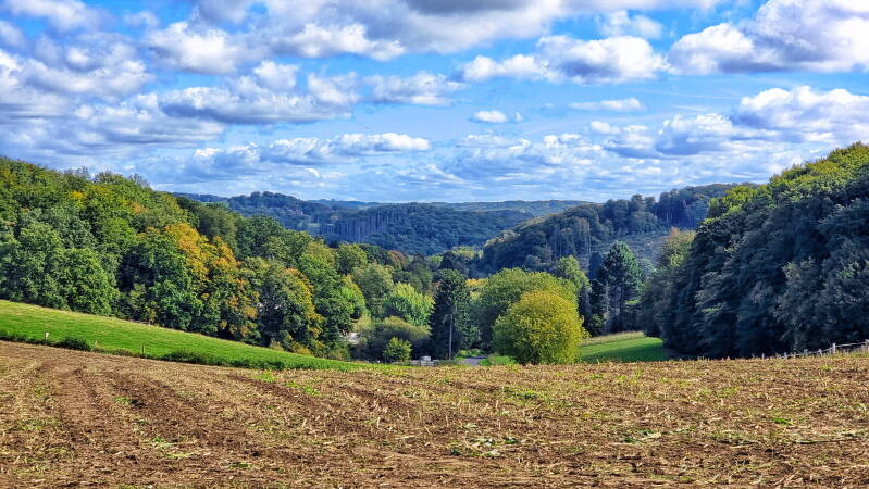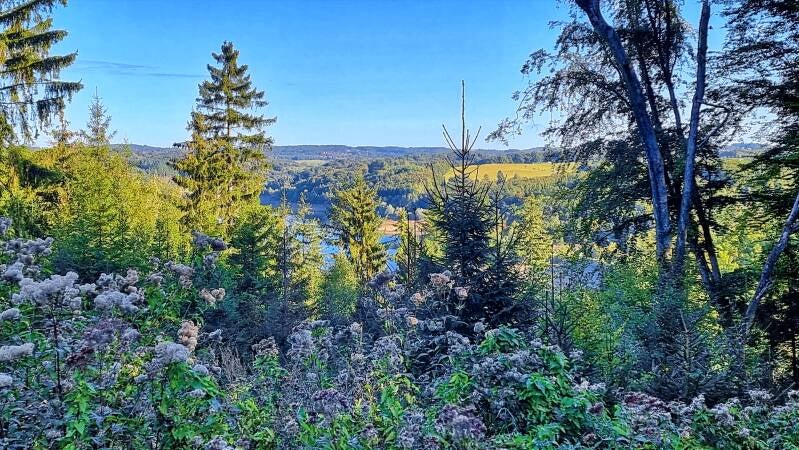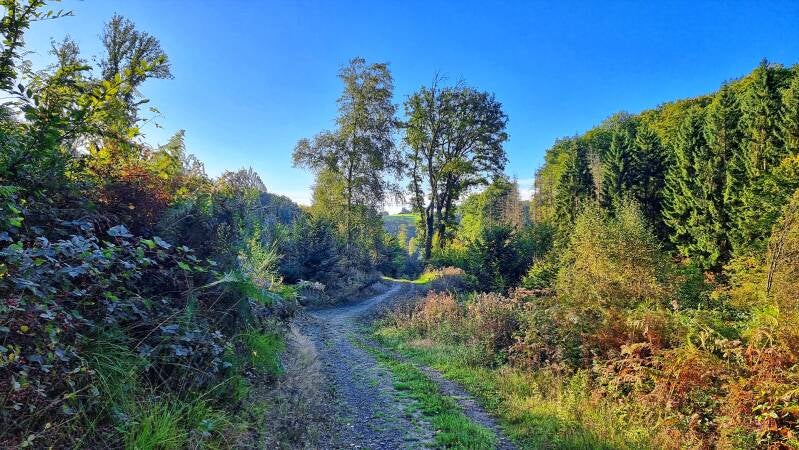 Auch hier lassen auf der anderen Seite die nächsten Höhenmeter nicht lange auf sich warten. Sie folgen dem Tal des Hutsherweger Bachs erst hinauf, dann auf der anderen Seite prompt wieder hinab. Der nächste Panoramablick kommt, bevor man den malerischen Stausee endgültig aus den Augen verliert. Doch das idyllische Tal des Oberstockberger Bachs, in das sich der Weg hinabwindet, ist ein durchaus akzeptabler Ersatz hierfür.