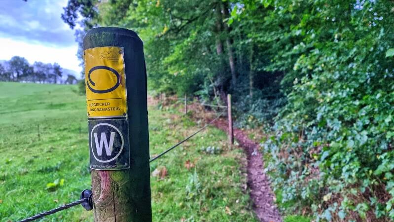 Vom Hauptweg zweigt an dieser Stelle ein unscheinbarer Waldpfad ab, der den finalen Abstieg einleitet und auf dem es auch zur Begegnung mit dem nächsten Etappenstein kommt. Die Neuensaaler Straße, welche der Panoramasteig eigentlich nur überquert, nahm ich zum Anlass, den Trail für heute zu beenden und mich zur nächsten Bushaltestelle in das vor mir liegende und zu Kürten gehörende Biesfeld zu begeben.