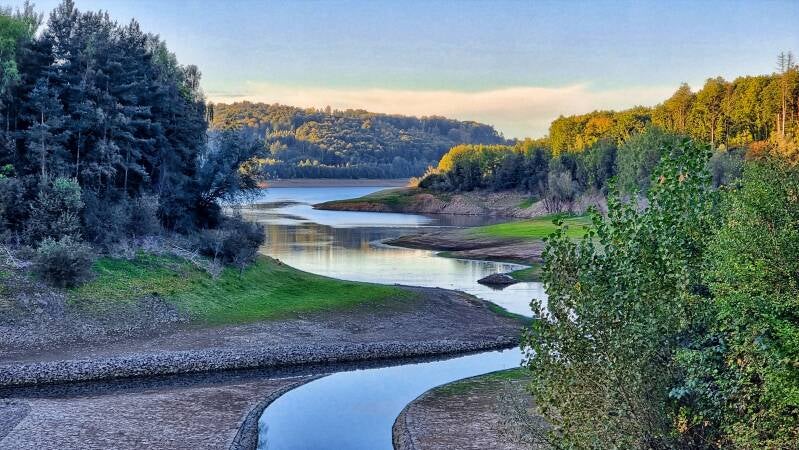 Während ich so auch in den Genuss der ersten Panoramablicke kam, leitete mich ein von Wiesen flankierter Weg nach Ober- und Unterpilghausen. Hier trifft man bald auf ein Wehr, das den Zufluss der Kleinen Dhünn reguliert und einen geradezu idyllisch wirkenden See entstehen ließ. Der aber ist nur Vorbote für ein viel komplexeres Stausystem, das aus mehreren weiteren Vorsperren und Zulaufbecken besteht und mit seinem schier unfassbaren Volumen von 81 Millionen Kubikmeter Wasser einen nicht unbeträchtlichen Teil der heutigen Wanderung dominiert: Die Große Dhünntalsperre.