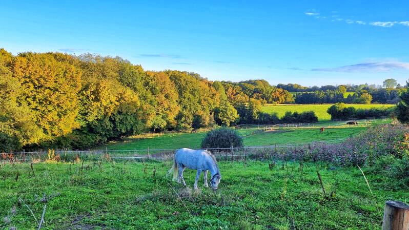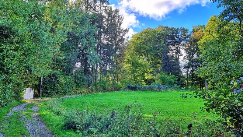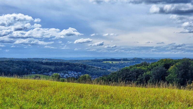 Angenehme Wechsel aus Wald und Wiesen begleiteten mich nun nach Richerzhagen. Wenn Ihr aber hinter dem Ort (und nach einem schönen Waldintermezzo) über die abwärts führenden Stufen zurück auf die Straße gelangt, nutzt dort, so lange es eben geht, den kleinen Trampelpfad. Man folgt der Straße zwar nur für 200 Meter. Aber wäre ich auch nur knapp auf dem Asphalt gelaufen, hätte mich das rücksichtslos von hinten heran- und nur äußerst knapp vorbeirasende Auto zweifellos auf die Motorhaube genommen.