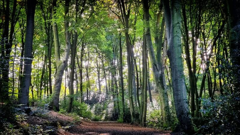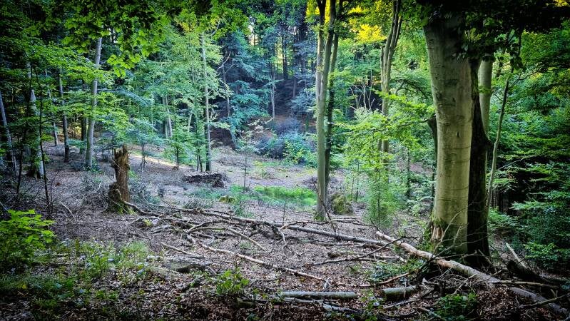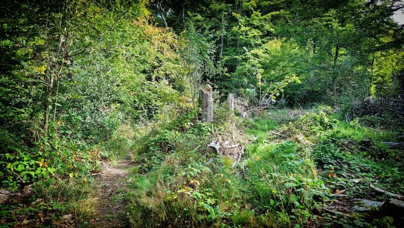 Wesentlich zügiger als mit den Öffis lief dann entsprechend auch die Anreise ab, so dass ich mich schon um 7 Uhr - und damit eine Viertelstunde vor Sonnenaufgang - an jenem etwas abseits gelegenen Parkplatz in Dhünn wiederfand. Auch von hier ließ sich jener Punkt gut erreichen, an dem ich meine Tour zuletzt unterbrochen hatte und wo von der Hauptstraße aus ein kleiner Pfad zurück in den Wald führt. Erst hinab zur Kleinen Dhünn - dann gleich wieder hoch bis zu einer Schutzhütte auf dem Kalkenberg.