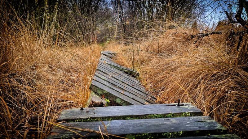 Hier nämlich stießen wir auf einen jener typischen hölzernen Stege, wie sie im Hohen Venn häufig anzutreffen sind. An diesem aber hatte der Zahn der Zeit schon in so fortgeschrittener Weise genagt, dass wir es mancherorts vorzogen, uns lieber durch den sumpfartigen Schlick vorzutasten.