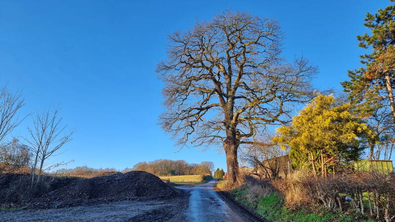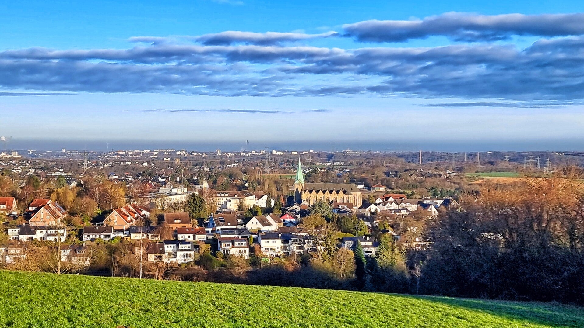 Insofern kann man sich getrost auf einen hochkarätigen Wandertag einstellen. Den ersten Eindruck bekam ich bereits am Bahrenberg, mit dem man zu Beginn gleich eindrucksvoll an Höhe gewinnt und an einer Weggabelung (mitsamt der ersten Bank) auf das unter sich liegende Niederwenigern mit der dominierenden St. Mauritius-Kirche blicken kann.