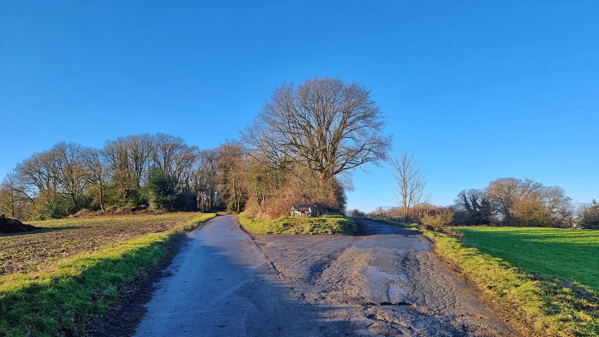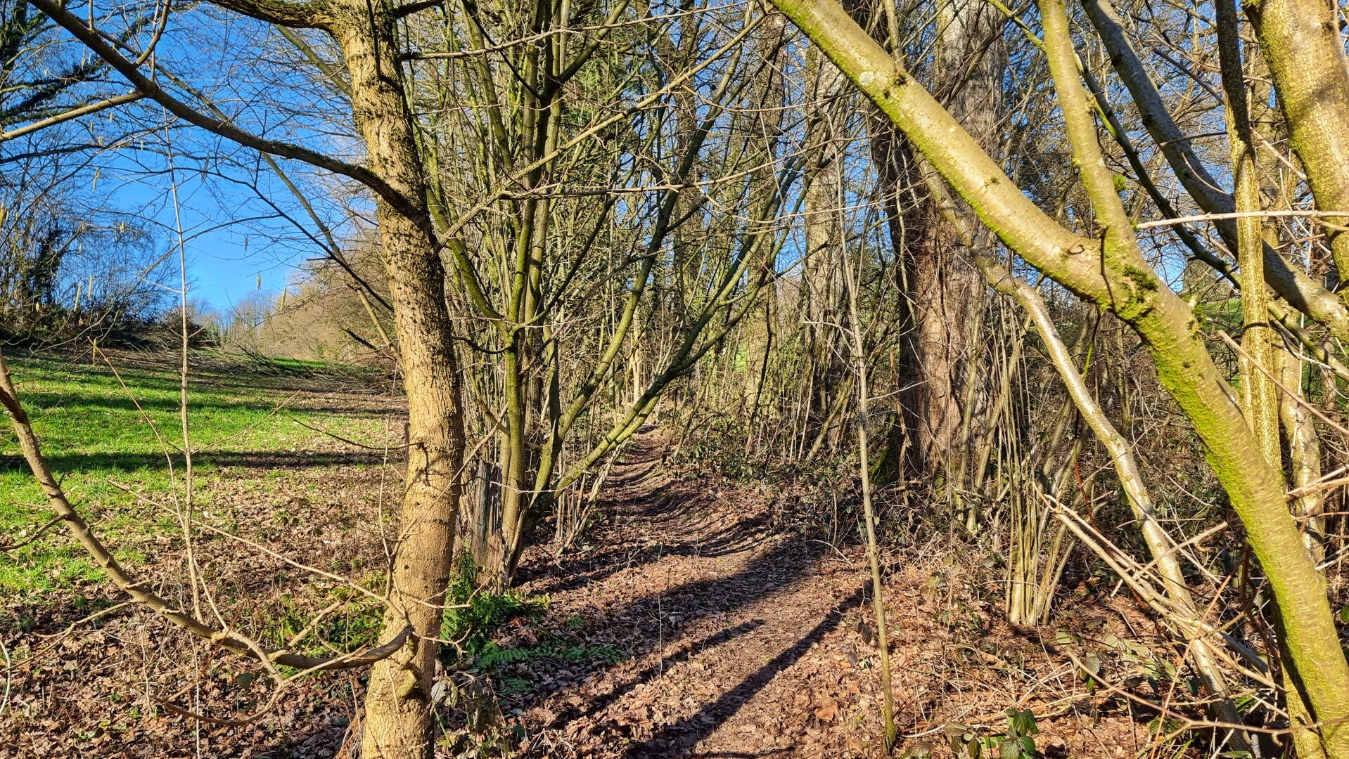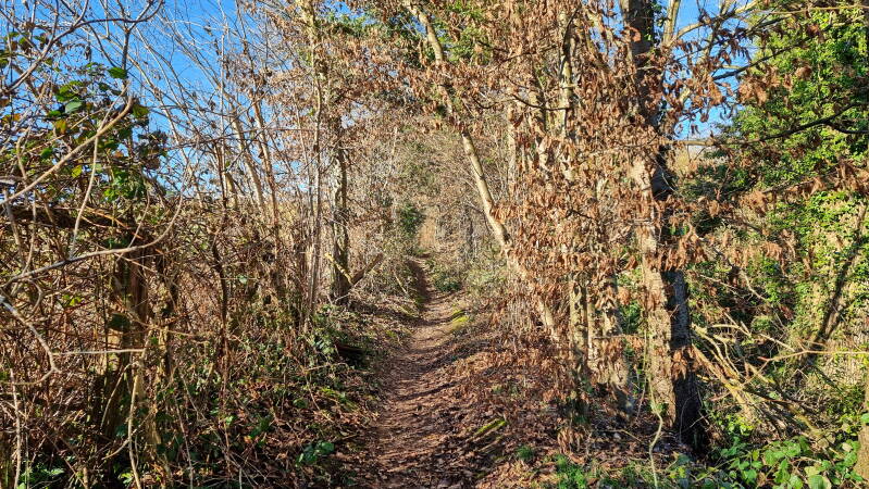 Über einen sonnendurchfluteten und von Hecken gesäumten Pfad bewegt man sich nun unmittelbar an dieser unsichtbaren Grenze entlang. Es ist das finale Stück der Etappe, das über die "Kötterei" und an einer Waldschule vorbei führt und schließlich auf die B224 mündet.