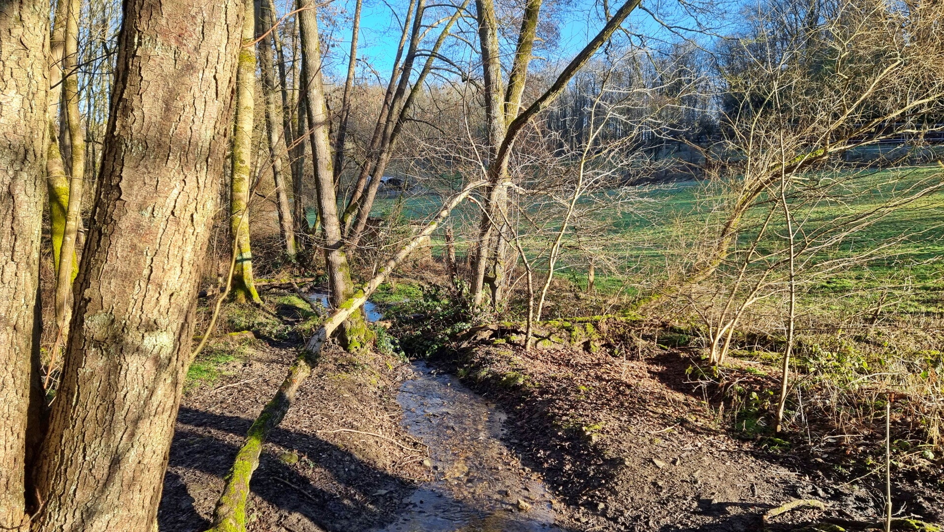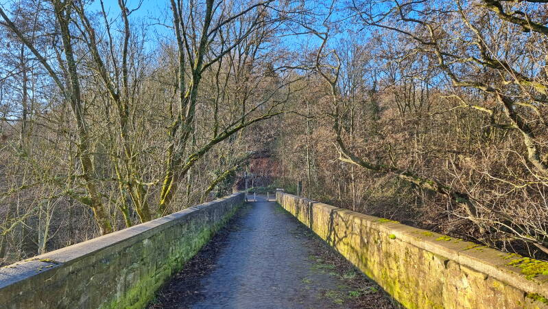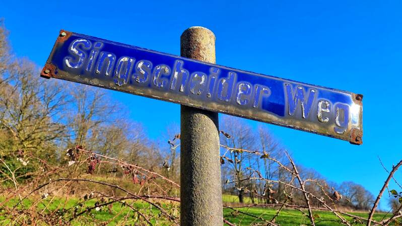 Ab Niederbonsfeld führt die asphaltierte, aber völlig ruhige Buschstraße ins Deilbachtal, wo man zugleich von Hattingen in den Essener Stadtteil Byfang, und nur kurz darauf nach Kupferdreh wechselt. Die Hundebrücke leitet über den Deilbach, und schon nach wenigen Minuten findet man sich auf dem nächsten Anstieg zur Singscheider Höhe wieder. Gleich mehrfach begegnet man in dieser Gegend dem Kupferdreher Rundweg, wechselt aber (wie ich unter anderem in den Steilhängen des Priehlbachs feststellte) zwischendurch auch auf andere Pfade.