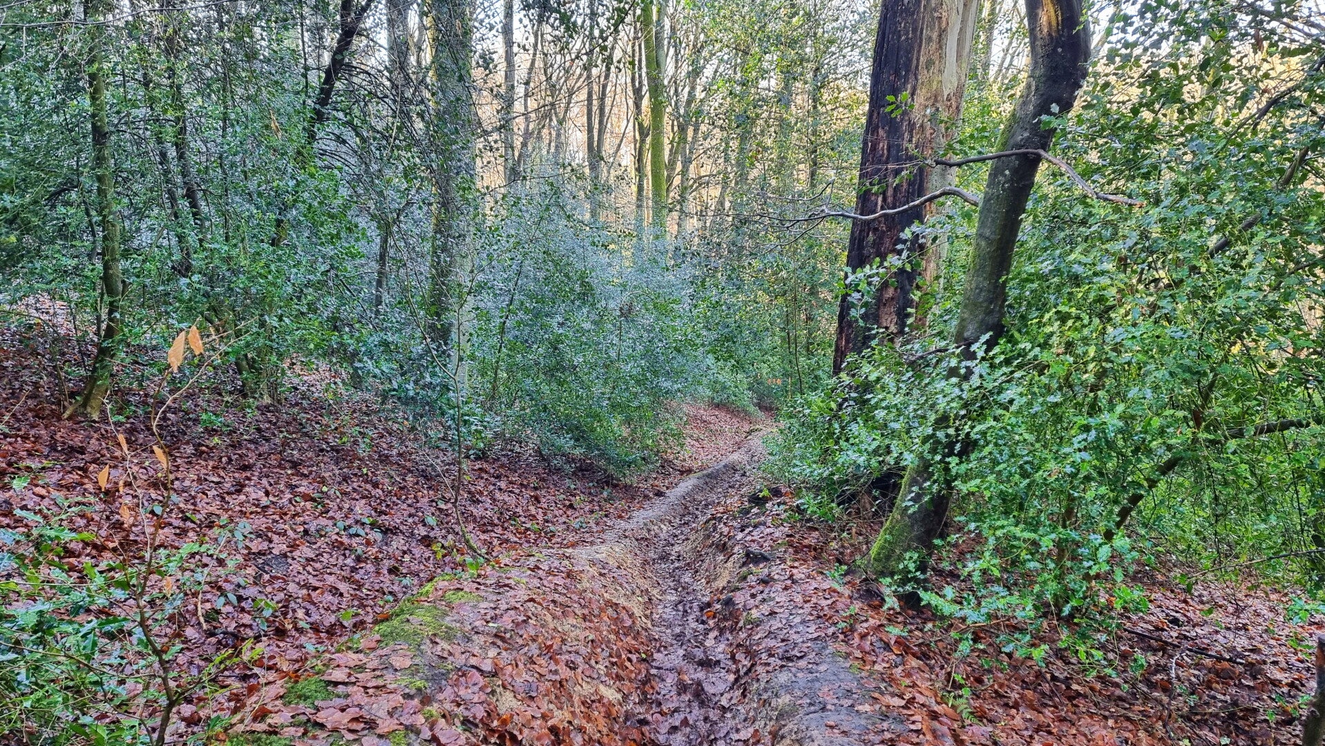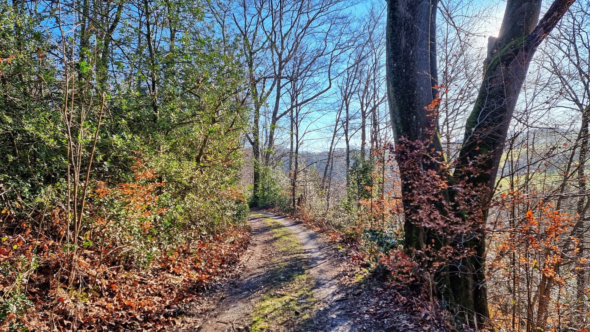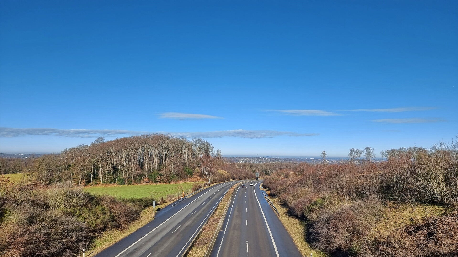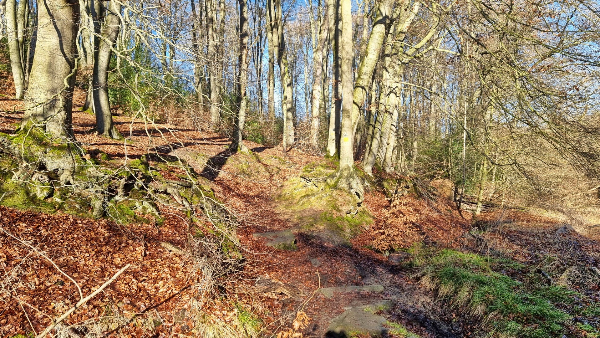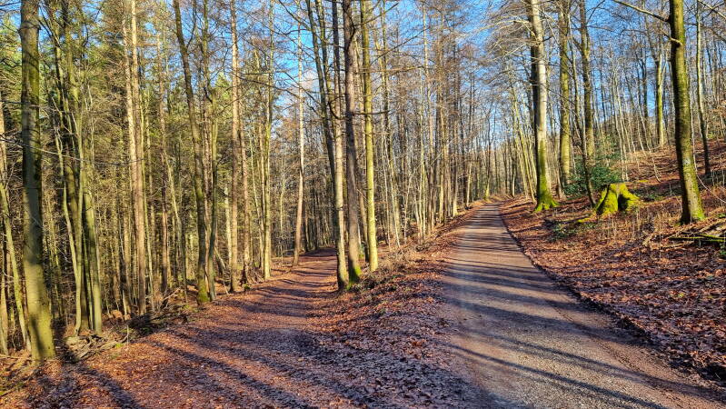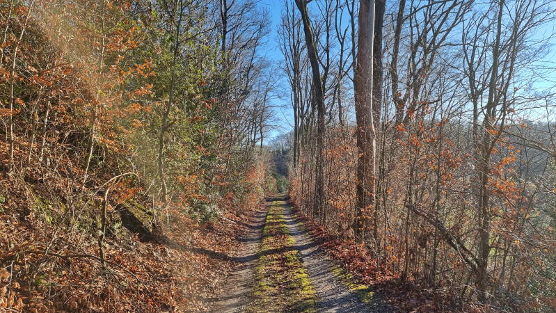 Hinter der Rotthauser Straße beginnt nach einem weiteren kurzen Privatweg eine tolle Waldpassage. Und obwohl die Autobahn in unmittelbarer Nähe bleibt, bekommt man vom Verkehrslärm kaum etwas mit. Viel unangenehmer fällt dagegen das kurze, aber recht unübersichtliche Stück der K 31 ins Gewicht, dem man in Ermangelung eines Fuß- oder Radweges folgen muss.