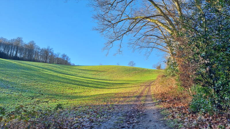 Es folgt ein morastiger Waldabschnitt, und infolge einer regenreichen Nacht wird es nicht die einzige schlammreiche Passage bleiben. Man erreicht den Grenzberg und wird sogleich wieder zwischen Pferdekoppeln hindurch abwärts geführt.