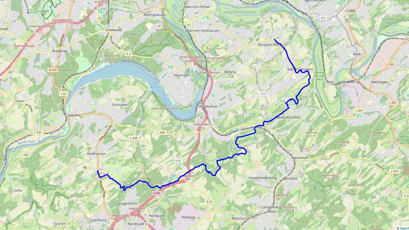Ein weiterer Grund, der diese Teilstrecke der Essener Umrundung zur Königsetappe macht, ist ihr (im Vergleich mit allen anderen Abschnitten) spürbar anspruchsvolleres Höhenprofil. Kein Wunder, haben wir es doch vornehmlich mit jenen Gefilden zu tun, in denen sich Ruhrgebiet und Bergisches Land begegnen, und das mit ihrem steil-hügeligen Gelände schon fast an das Niveau der Eifel heranreicht: die Elfringhauser Schweiz.