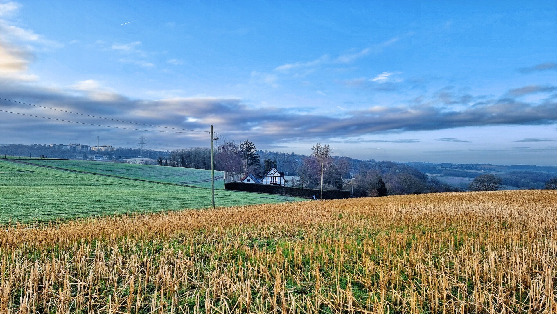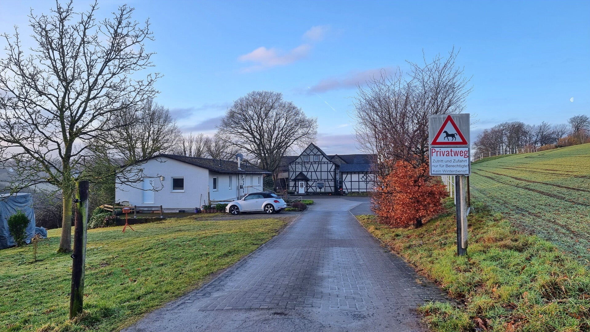 Aus dem Tal herausgestiegen, traf ich auf hügelige Wiesen und tolle Weitblicke. Wo Tüschener Weg, Honnschaftenstraße und der Geilinghausweg zusammentreffen, folgte ich letzterem, bis ein kaum sichtbarer Pfad nach links abgeht. Wieder ein Privatweg, auf dem Wanderer allerdings willkommen sind.