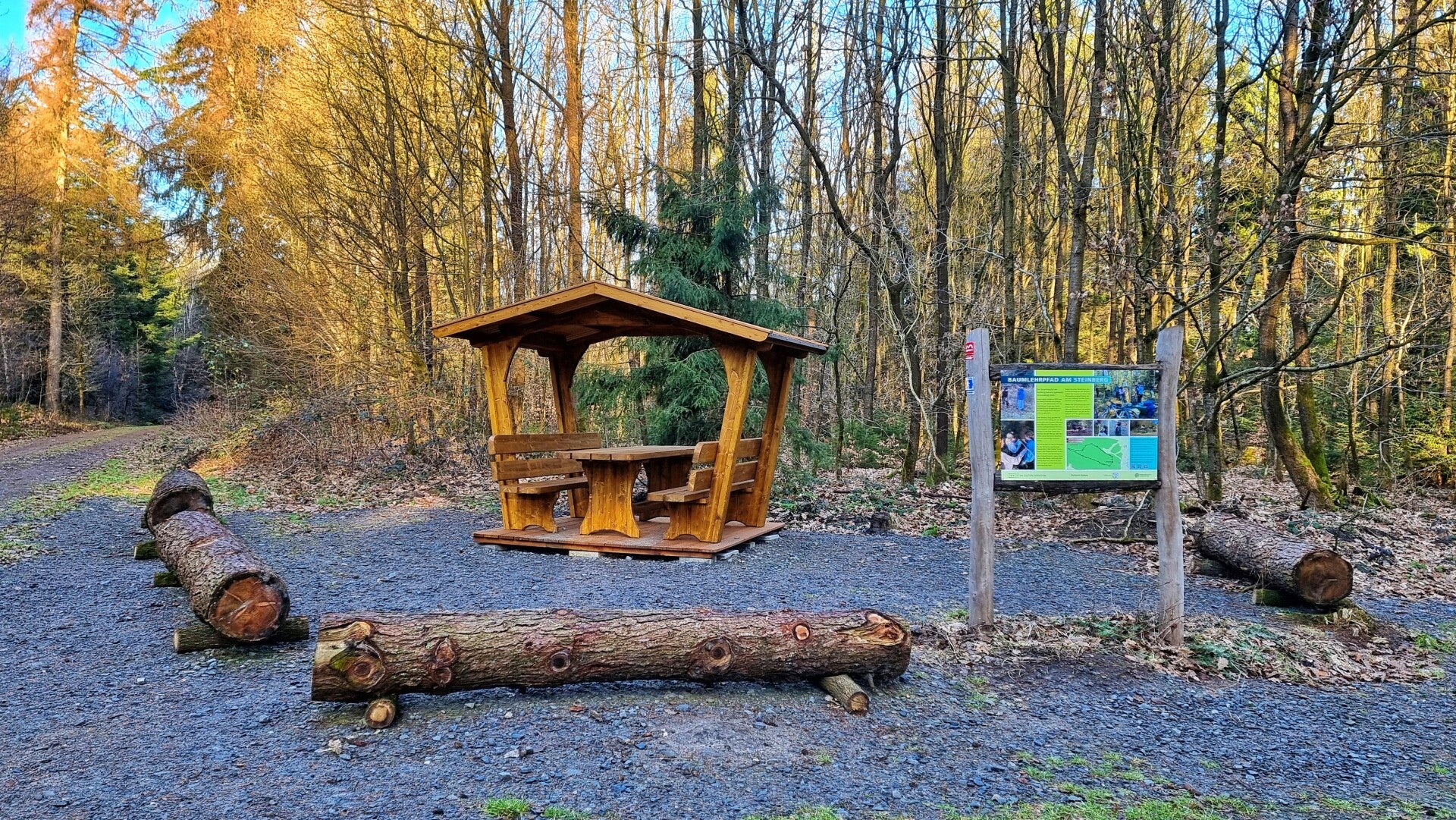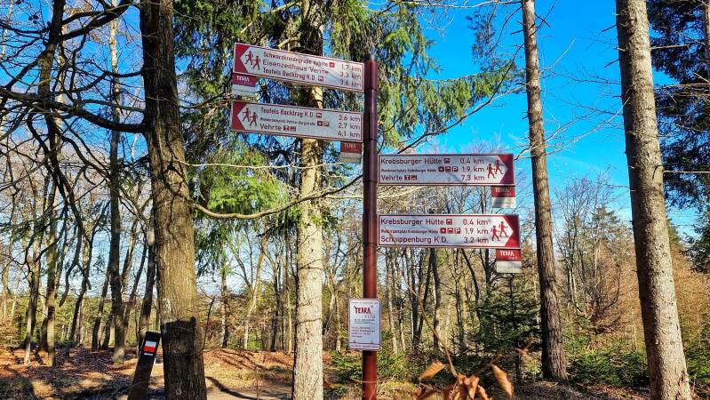 Neben einem Schützenhaus wendet sich die Route nach links. Hier beginnt ein Hauptwanderweg, der für die nächsten anderthalb Kilometer einen nördlichen Bogen um die Erhebung der "Krebsburg" zieht. An einer gut beschilderten Weggabelung heißt es dann, sich rechts zu halten, bevor nach weiteren 500 Metern noch ein Abzweig folgt. Hier geht es abermals nach rechts, wo die bereits hinter den Bäumen hervorlugende Krebsburger Hütte eine willkommene Rastgelegenheit bietet.